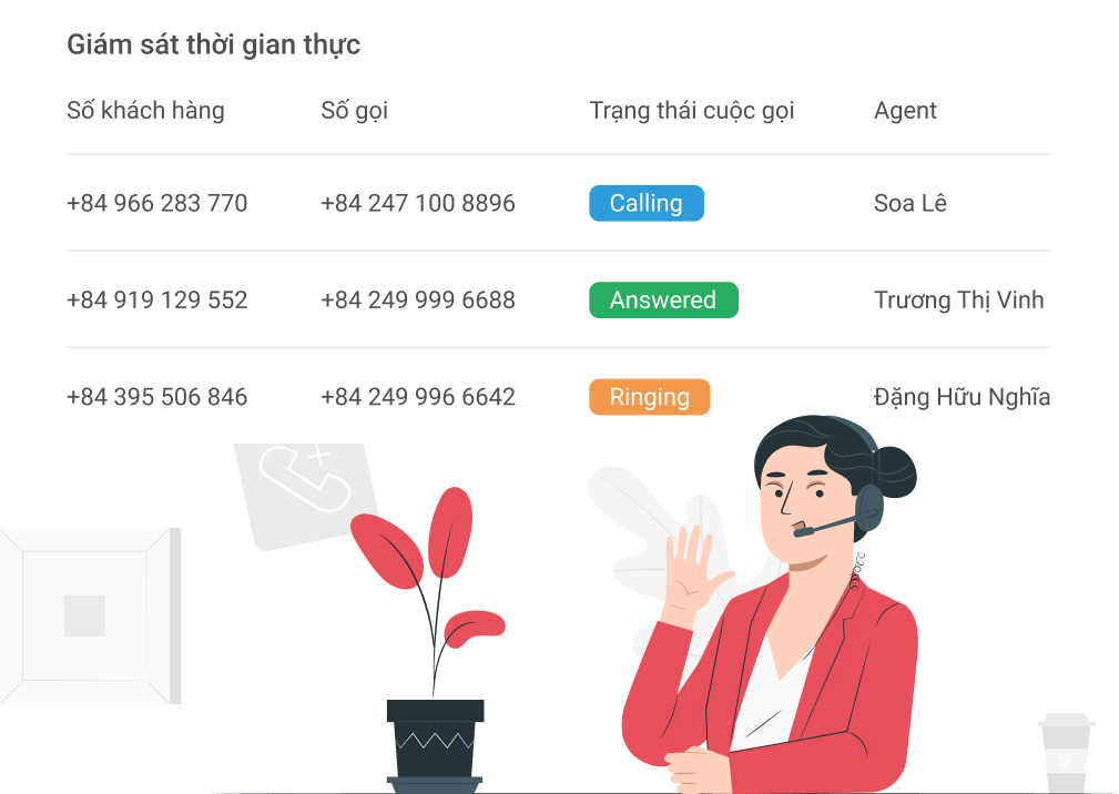 Giám sát cuộc gọi, nhân viên, hàng đợi, hiệu suất tổng đài theo thời gian thực.